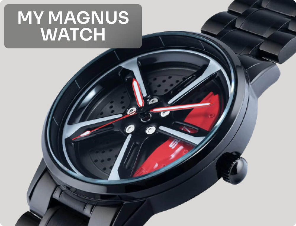 Costruite il vostro orologio Magnus Performance definitivo. Scegliete tra vari cerchi con pinze freno, scegliete il vostro colore preferito e un cinturino abbinato.